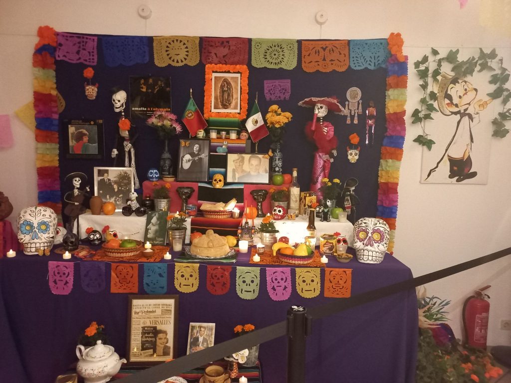 Dois altares tradicionais mexicanos que homenageiam Amália Rodrigues e Cantinflas.