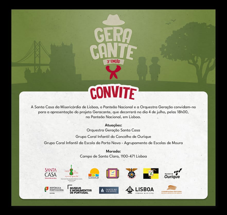 Ler mais…: Geracante4 jul |18:15 Orquestra Geração Santa Casa e os grupos infantis de cante coral alentejano de Moura e Ourique. Este projeto inovador reúne a Orquestra Geração Santa Casa e os grupos infantis de cante coral alentejano de Moura e Ourique. Com c. de 100 crianças possibilita um intercâmbio cultural e musical que celebra o Cante…